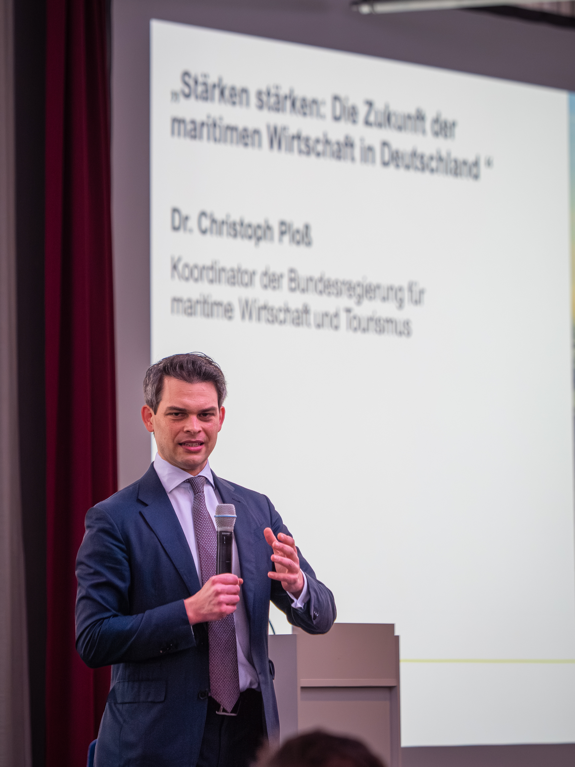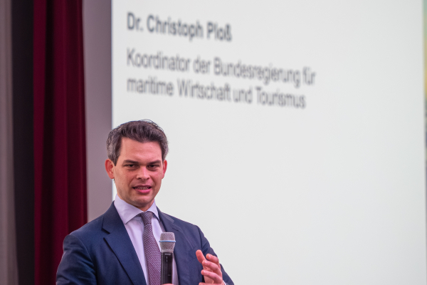 Bernhard Kluttig, Leiter der Abteilung Industriepolitik im BMWE, betonte in seinem Grußwort den Pioniergeist in der maritimen Wirtschaft. „Um die Klimaziele zu erreichen, braucht es kluge Köpfe und Menschen mit Entschlossenheit.“ Mittlerweile sei klar, dass „grüne Moleküle“, also mit erneuerbaren Energien produzierte E-Fuels, die Zukunft bestimmen. „Es fehlen aber noch grüne Transportwege“, so Kluttig. Die maritime Branche habe eine Schlüsselstellung im Klimaschutz.
