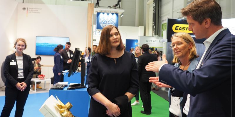 Mehrere eindrucksvolle Exponate stehen beispielhaft für die gelungene Forschungsförderung aus dem „Maritimen Forschungsprogramm“, das von PtJ im Auftrag des BMWK umgesetzt wird. So schwebt das gelbe Modell eines innovativen Unterwasserfahrzeugs über dem Messestand des BMWK. Dort sind auch spezielle Propeller und ein großes Ruderblatt zu sehen, das die Form der Brustflossen von Buckelwalen technisch aufgreift. Zudem werden Videos mit Highlight-Projekten aus dem Forschungsprogramm und eine neue Web-Anwendung an einem Touch Tisch präsentiert. Am Eröffnungstag besuchte die Koordinatorin der Bundesregierung für Maritime Wirtschaft und Tourismus, Claudia Müller, bei einem Rundgang den von PtJ organisierten Stand und würdigte die Bedeutung der Forschungsförderung zur Entwicklung neuer Technologien auf dem Weg zur Klimaneutralität und zur digitalen Transformation im maritimen Sektor.